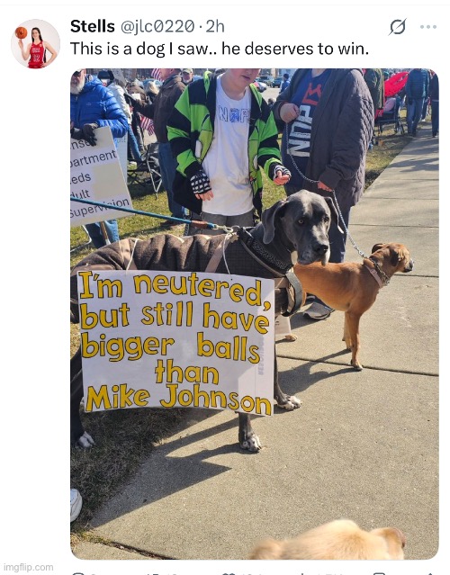 (17,600 posts)My vote goes to the dog with the sign about being neutered and still having more balls than Mike Johnson!